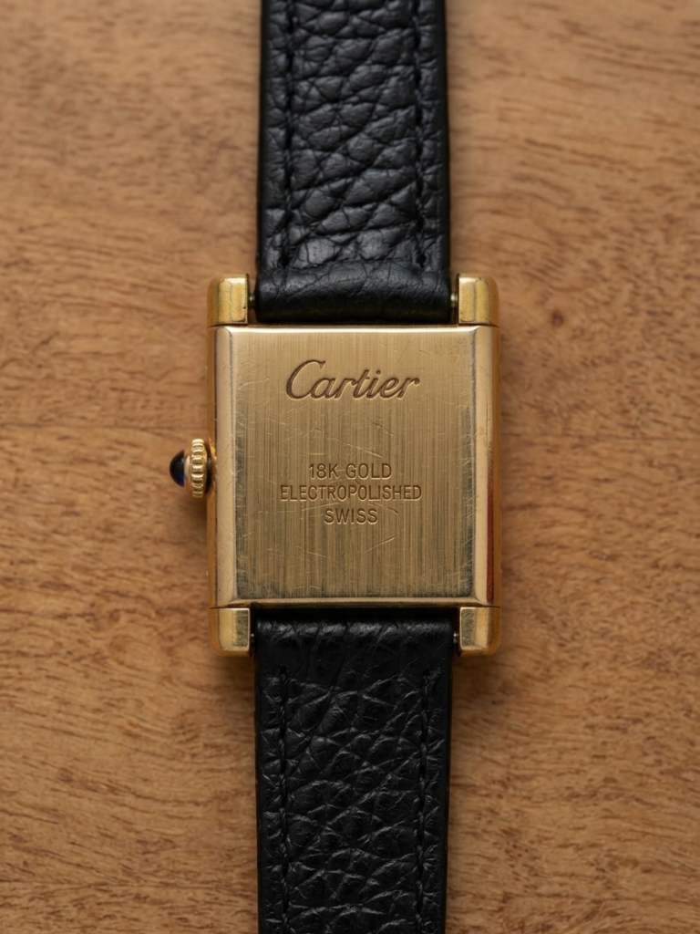 ​El grabado «Electropolished» en la tapa trasera revela su origen: es un método de chapado en oro de alta calidad utilizado principalmente en las boutiques de Cartier en Nueva York y Londres durante una época en la que las sedes operaban de forma semi-independiente. Portar este reloj no es solo llevar un accesorio de lujo; es poseer un fragmento de la era más experimental y glamurosa de la marca, donde la joyería y la relojería mecánica se fusionaron para sobrevivir a la crisis del cuarzo con estilo absoluto.