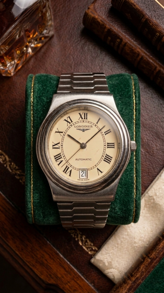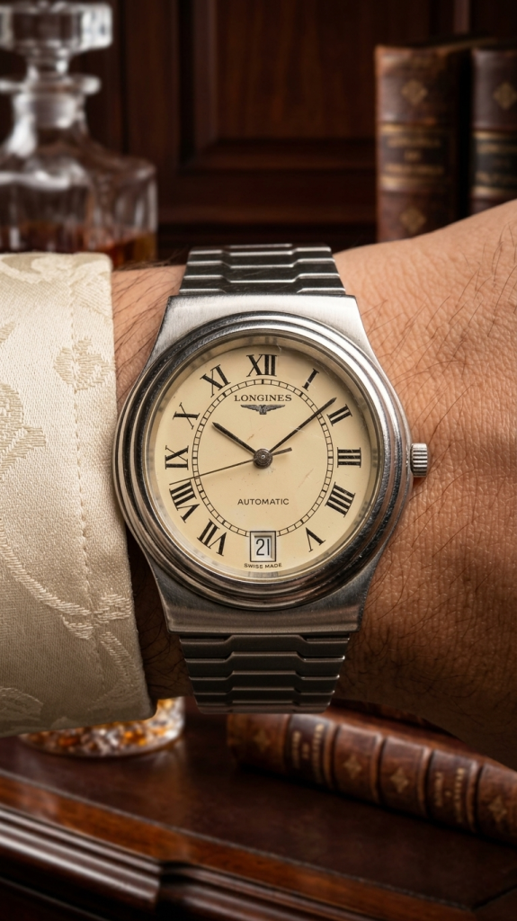 ​Este reloj destaca por romper la estructura tradicional de «caja y correas». El diseño se basa en la continuidad visual, donde las asas desaparecen para dar paso a un brazalete integrado que parece nacer del mismo cuerpo del reloj. La esfera en tono crema o champagne, junto con el fechador a las 6 en lugar de las tradicionales 3, aporta una simetría perfecta que evoca el refinamiento clásico de la marca, pero con una ejecución técnica moderna para su tiempo. Fue una época donde Longines demostró que podía competir en diseño con las casas más grandes de la alta relojería, manteniendo su identidad de «Elegancia es una actitud».
