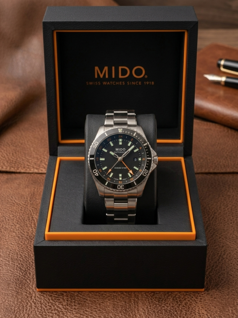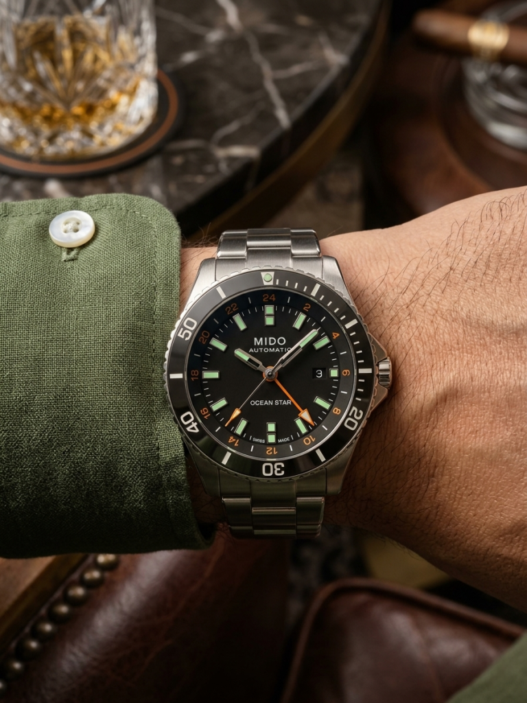​El Mido Ocean Star GMT es la herramienta definitiva para quienes no conocen fronteras. Con su distintiva manecilla naranja de segundo huso horario y un bisel cerámico de alta tecnología, este reloj no solo domina las profundidades marinas con su resistencia de 200 metros, sino que también se convierte en el compañero perfecto para cruzar océanos. Es una declaración de estilo deportivo y precisión suiza, diseñada para el hombre que busca un reloj imponente que se sienta tan cómodo en una reunión de negocios como en una aventura de buceo.