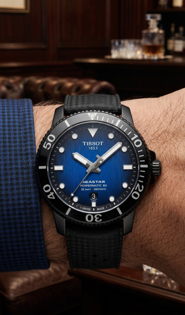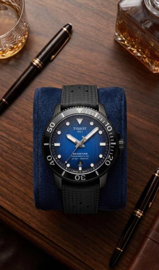Su diseño está pensado para la legibilidad extrema: las agujas y los índices cuentan con un revestimiento de Super-LumiNova® que brilla con intensidad en la oscuridad total. El cristal de zafiro es prácticamente irrayable, protegiendo una esfera con degradados profundos que evocan el océano. Además, su fondo de caja transparente permite admirar el movimiento mecánico en acción, algo poco común en relojes con una resistencia al agua de 30 bares (300 metros). Es la pieza ideal para el hombre que busca un reloj robusto, pero con la elegancia necesaria para una cena formal.